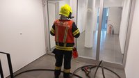 Ein Atemschutztrupp rückte sofort mit einem CO₂-Löscher zur Erkundung in den stark verrauchten Serverraum vor. Parallel dazu wurde ein HD-Rohr für einen möglichen Löschangriff vorbereitet und die FF Walchen errichtete eine Wasserversorgung vom nahegelegenen 200 m³ Löschwasserbehälter.